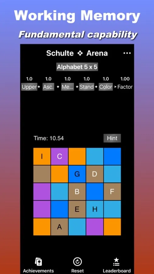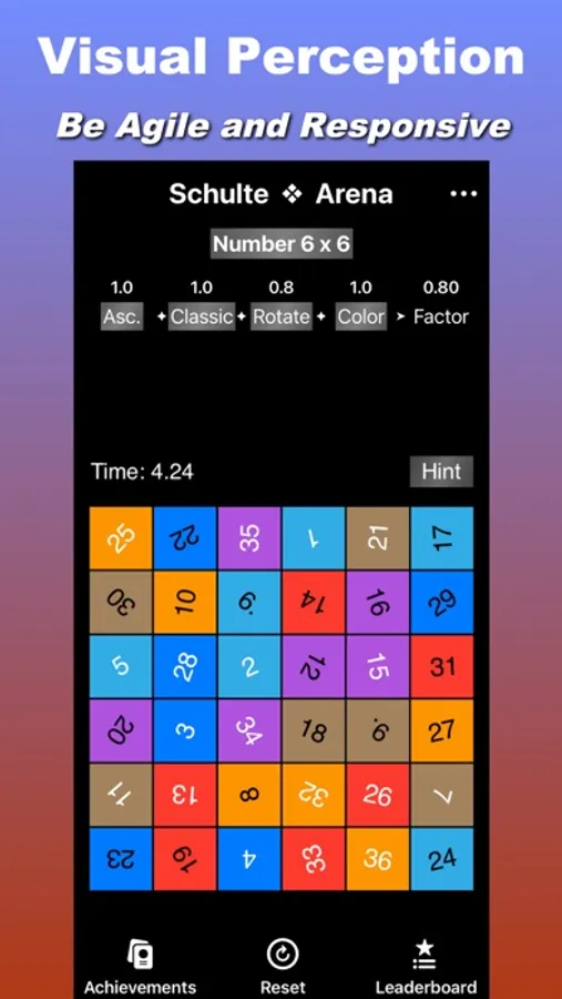 This is a comprehensive Schulte Table training app that goes beyond traditional apps, features Number tables (4x4, 5x5, 6x6) and Alphabet tables (5x5), each of which supports lots of configurations in order, color, shape and dynamic effects. Every kind of tables have five training modes: classic, shift, swipe, mark and memory mode, each of that focuses on training different functional parts of human brain, giving you the most comprehensive brain training. Rich features in the app including Light/Dark appearances, haptics, sound effects, etc. will provide you a superior training experience.