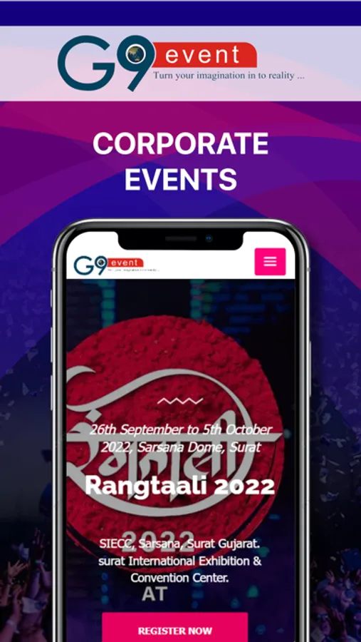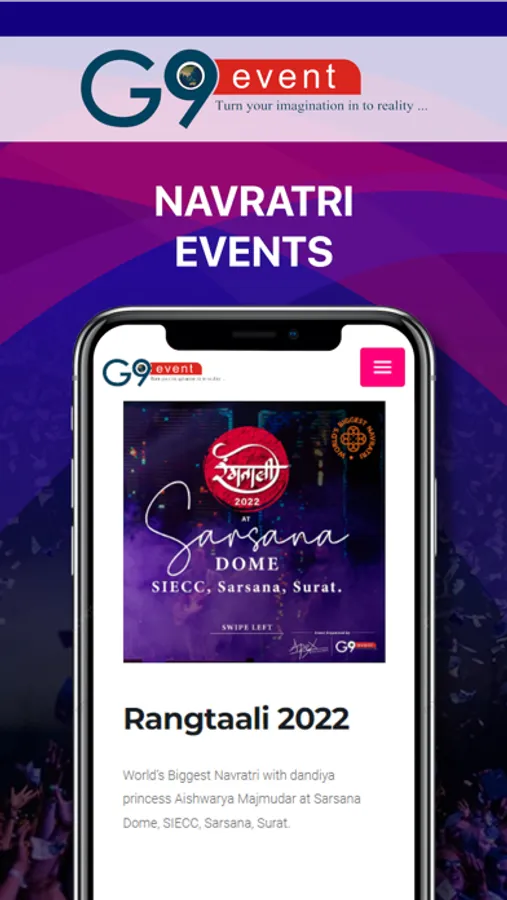 G9 EVENT had done individually / JV,23 successful Navratris & more than 30 Mega Star shows involving Bollywood Celebrities i.e. SONU NIGAM, ATIF ASLAM, HIMESH RESHMIYA, SHREYA GHOSAL, AKSHAYKUMAR, DALER MEHNDI, MIKA SINGH, JAGJIT SING, BADSHAH LIVE IN CONCERT, NEHA DHUPIA, AADESH SHRIVASTAV, MUGDHA GODSE, PREETI JANGHITANI, PRATIMA KAZME, RATI AAGNIHOTRI, DEEPAK ANANDJI, PIYUSH RAJANI, BAMBOO BITS, IMRAN HASMI in SURAT.
