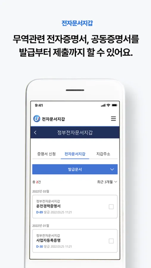 전자문서지갑은 무역, 물류 및 시험성적서 등 산업에서 발급되는 증명문서를 송수신 하고, 열람, 증명 할 수 있는 서비스 입니다.