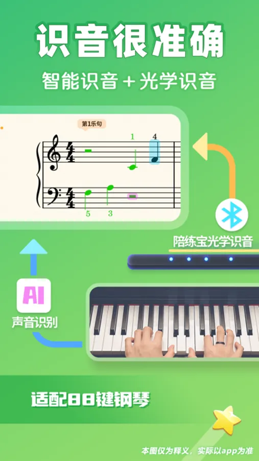 弹错等待,还可以召唤出键盘提示来指明要弹奏的音符,根据节奏、速度、平稳度评分,帮助您解决弹错音、节奏不准确的问题。