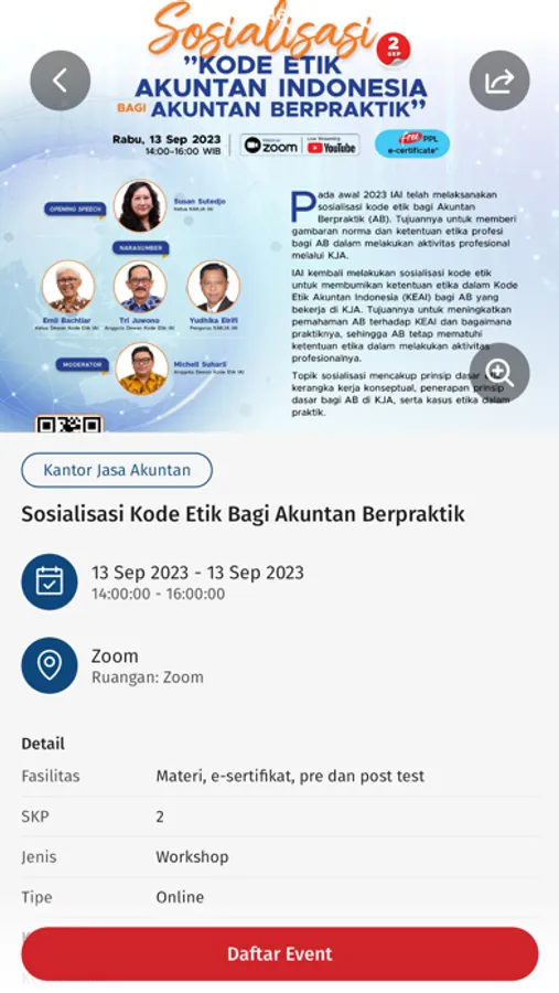 Aplikasi ini membantu anggota maupun non anggota IAI utuk dapat mengiuti kegiatan-kegiatan yang ditujukan untuk profesi akuntan maupun profesi non akunan yang ingin menambah wawasan ilmu yang terkait dengan akuntansi dan keuangan.