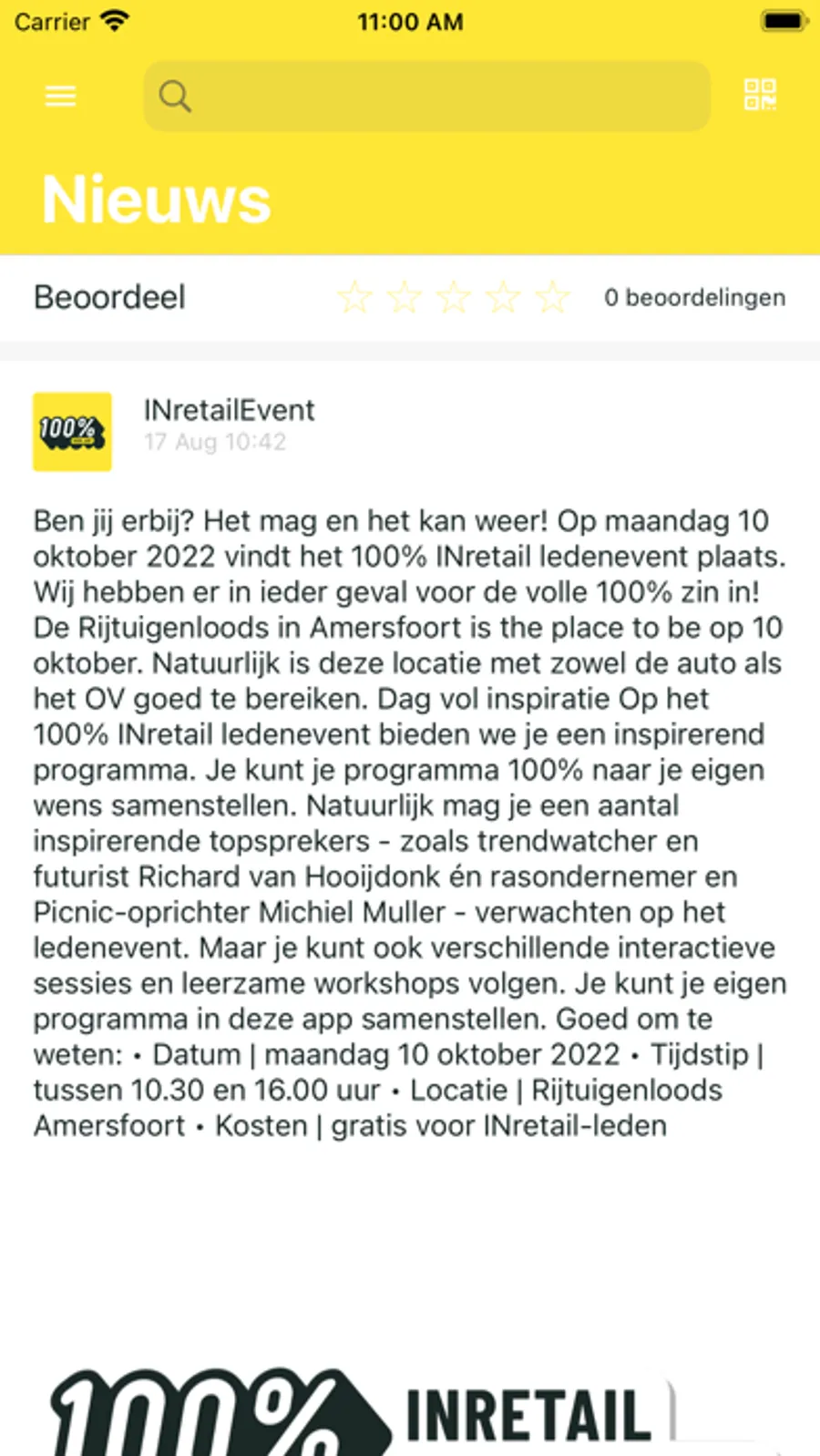 Op het 100% INretail ledenevent bieden we je een inspirerend programma. Je kunt je programma 100% naar je eigen wens samenstellen. Natuurlijk mag je een aantal inspirerende topsprekers - zoals trendwatcher en futurist Richard van Hooijdonk én rasondernemer en Picnic-oprichter Michiel Muller - verwachten op het ledenevent. Maar je kunt ook verschillende interactieve sessies en leerzame workshops volgen. Je kunt je eigen programma in deze app samenstellen.