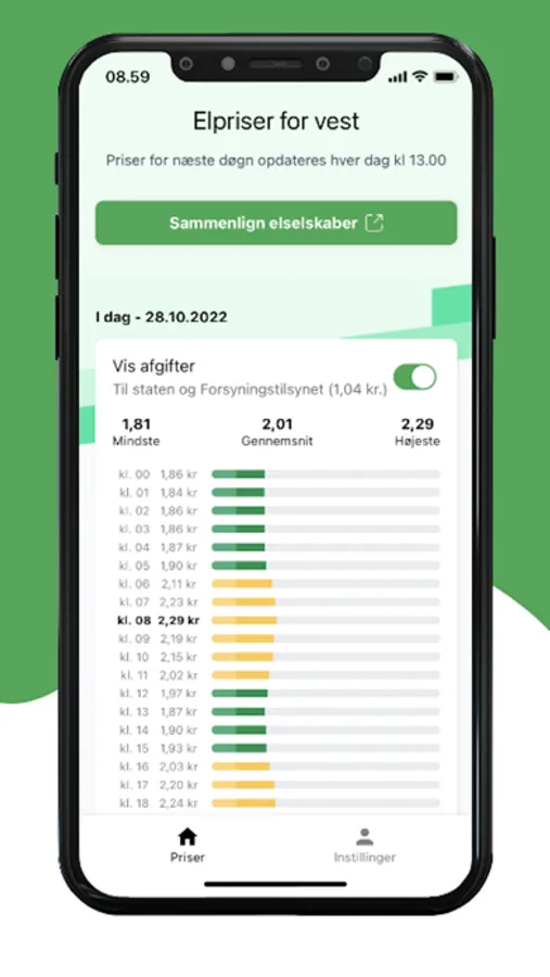 Fordelen ved at følge med i elprisen time for time er, at du får mulighed for at planlægge dig til en billigere elregning. Når du henter app’en kan du se, at der kan være stor forskel på elprisen i løbet af et døgn. Udover at kunne se prisen time for time, så er det ligeledes muligt at se døgnets gennemsnitspris samt højeste og laveste pris per dag.