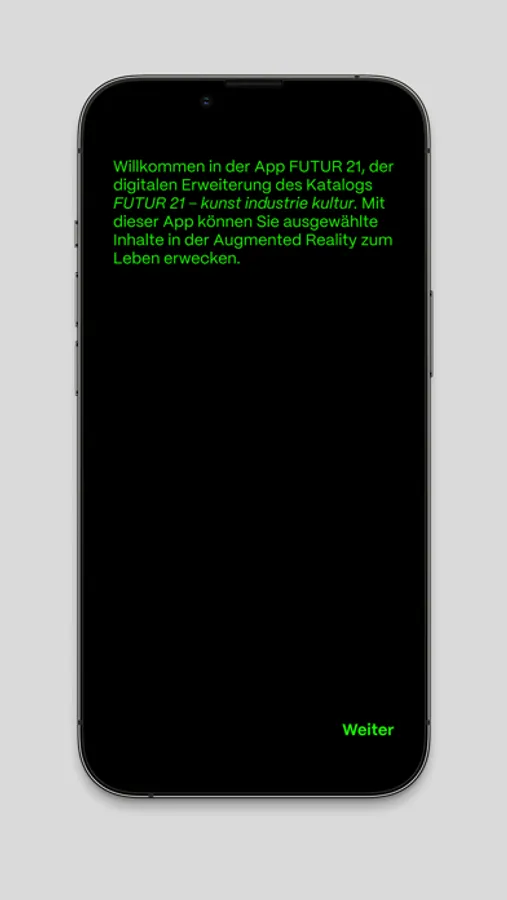 Die FUTUR 21 App ist eine digitale Erweiterung des Katalogs »FUTUR 21 – kunst industrie kultur«. Ausgewählte Inhalte werden per Augmented Reality zum Leben erweckt – Videos und 3D-Objekte bieten zusätzliche Einblicke in die künstlerischen Arbeiten, die im Katalog präsentiert werden.