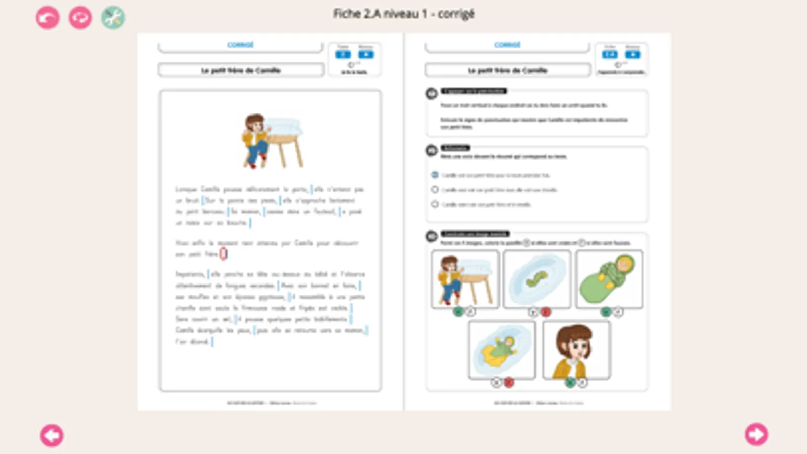 L’application de vidéoprojection permet de visualiser et d’écouter l’ensemble des textes, de projeter les fiches et leur corrigé, et d’ajouter des notes, masquer ou mettre en valeur des éléments via la boite à outils graphiques. Il est possible de projeter une version différenciée des textes comportant des aides à la lecture pour les élèves en difficulté.