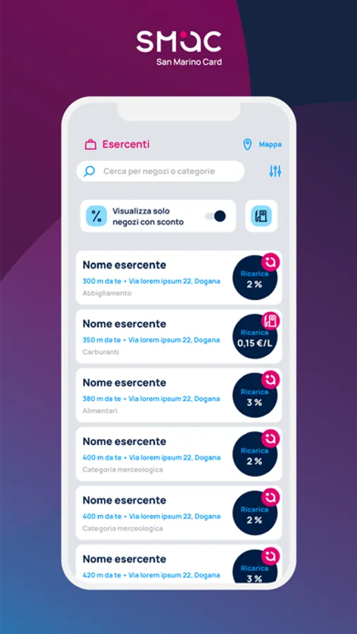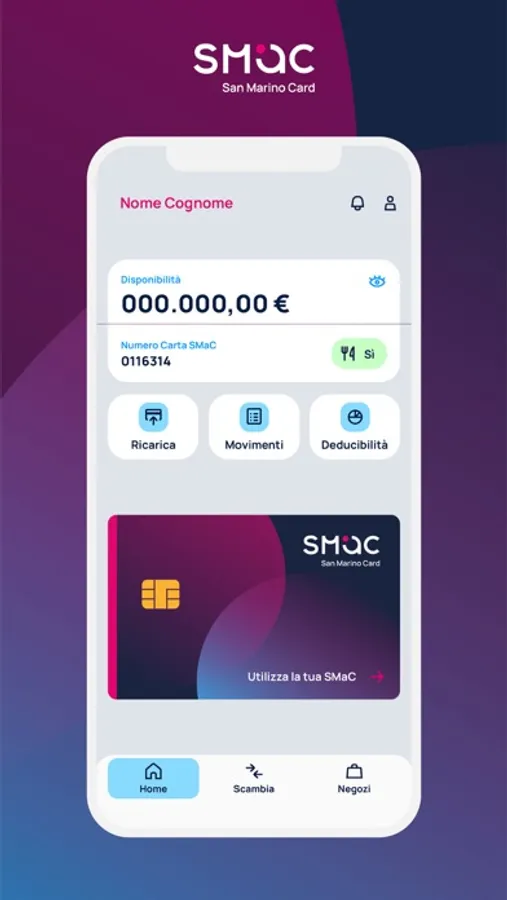 L’app della SMaC è stata completamente ridisegnata ed arricchita di nuove importanti funzionalità. Da oggi potrai utilizzare direttamente l’APP per effettuare pagamenti e ricariche fiscali presso i merchant convenzionati senza utilizzare la Card Fisica. A partire dalle prossime versioni sarà possibile trasferire denaro da un SMaC ad un’altra semplicemente inquadrando un QR Code. Si potranno tenere costantemente monitorate tutte le spese e quelle effettuate direttamente tramite l’APP saranno visibile in maniera istantanea.