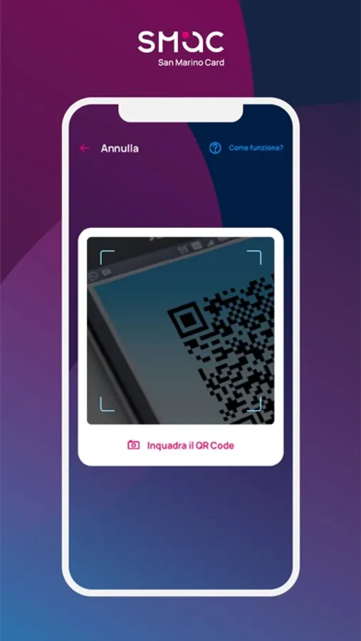 • Effettuare transazioni fiscali SMaC direttamente dall’Applicazione inquadrando il QR Code esposto sul POS dell’esercente.