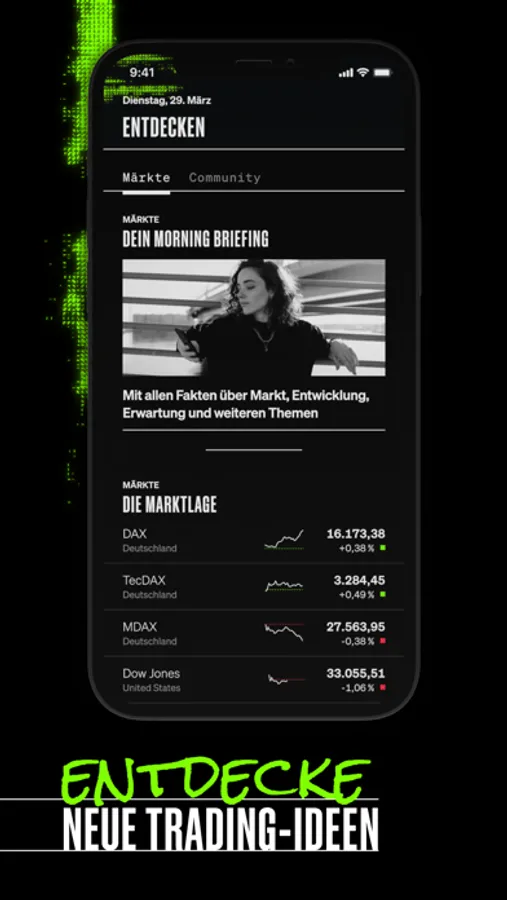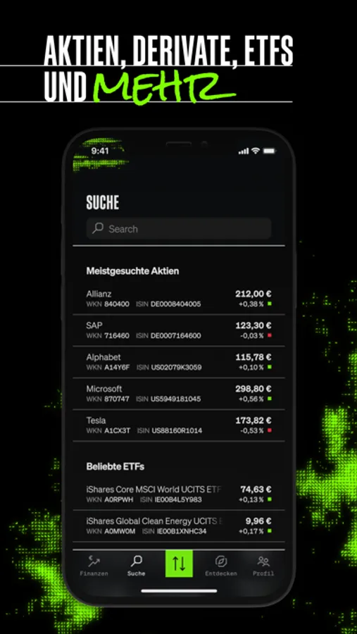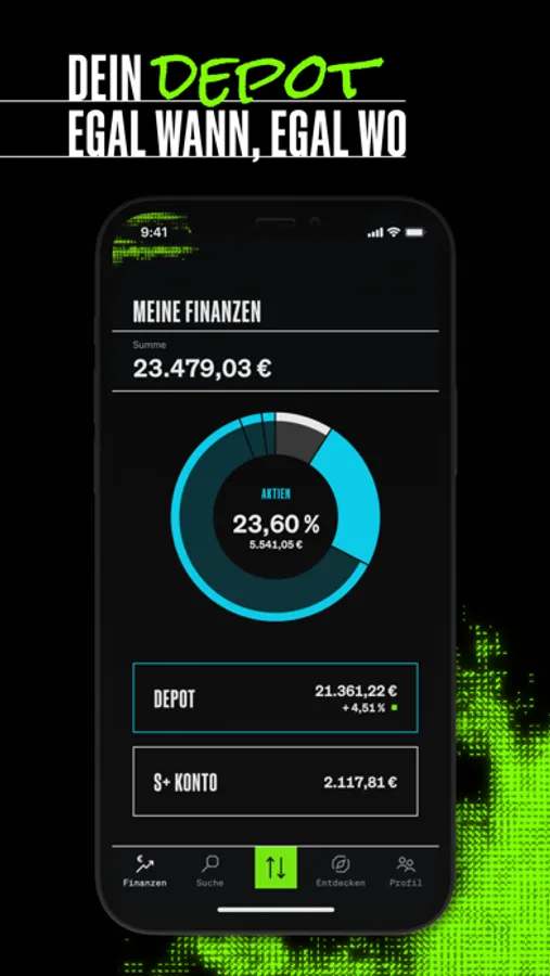 - Entdecken-Bereich: Börsen-News des Tages, Top- und Flop-Aktien aus dem DAX, die meistdiskutierten Aktien in der Community sowie eine ETF-Branchenübersicht – die S+ App hält dich immer auf dem Laufenden über deine Finanzen und deine Aktien-Investments