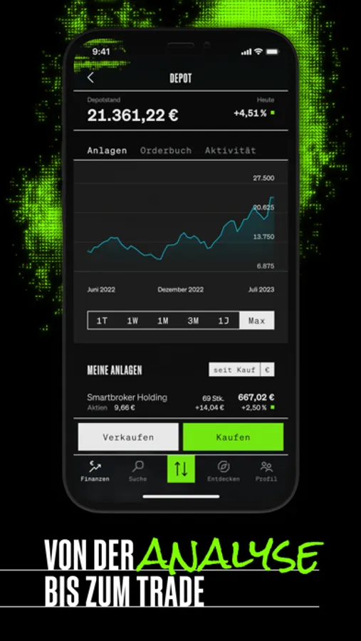 Die S+ App bietet dir mehr, als nur Aktien oder ETFs zu kaufen: Der Entdecken-Bereich versorgt dich mit aktuellen News aus der Finanzwelt und Informationen zu deinen Lieblings-Aktien. Was sind aktuelle Top- und Flop-Aktien? Welche Aktien werden in der Community heiß diskutiert? Und welche Branchen kannst du über ETFs bequem ins Depot holen? Egal ob neues Chartsignal, spannende Börsen-News oder wichtige Analysteneinschätzungen zu einer Aktie: Mit der S+ App bleibst du bei deinen Finanzen auf dem Laufenden.