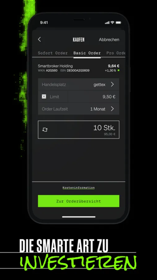 - Wähle deine Lieblings-Ordertypen fürs Trading: Kaufe Aktien je nach Marktlage oder persönlicher Präferenz in den Ordertypen Real-Time, Limit, Bestens, Billigst oder begrenze deine Verluste mit Stop-Loss