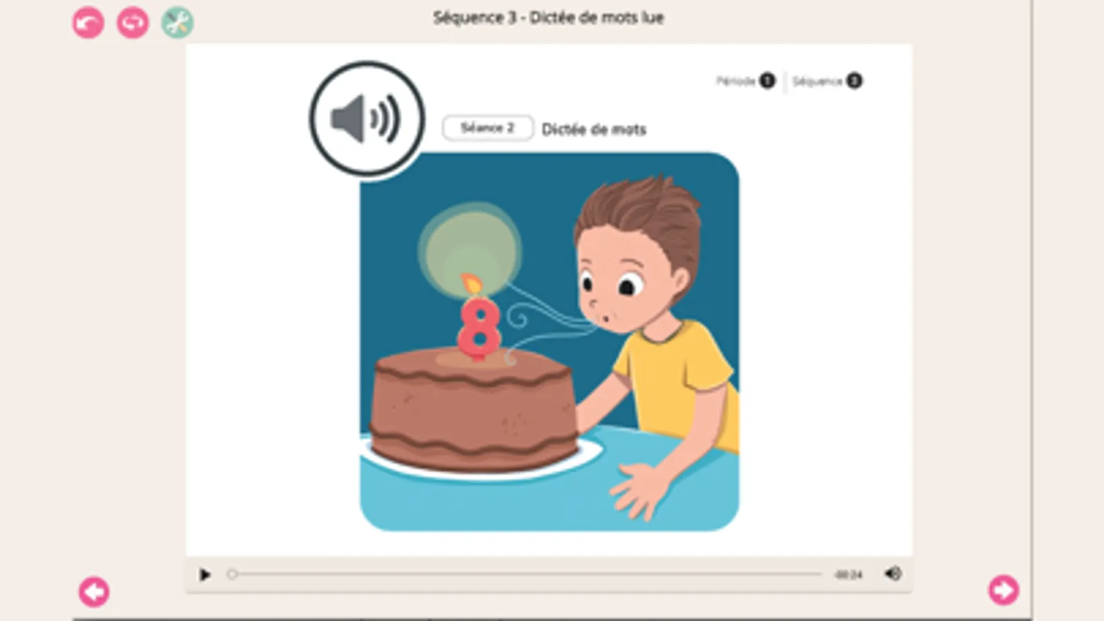 L’application de vidéoprojection permet de visualiser et d’écouter l’ensemble des dictées, de projeter les exercices d’étude de la langue et leur corrigé, et d’ajouter des notes, masquer ou mettre en valeur des éléments via la boite à outils graphiques. Toutes les dictées y sont enregistrées.