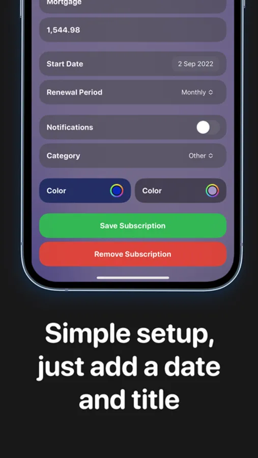 SubsTrack allows you to keep track of your events easily with a simple setup process, just add a title, price and renewal date and you're good to go!