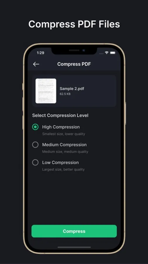 Users can compress files like high, medium, and low PDF Files using the PDF Converter app.