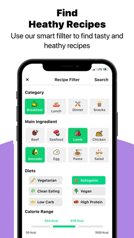 Hundreds of healthy and tasty recipes adapt to your calorie needs and preferences.