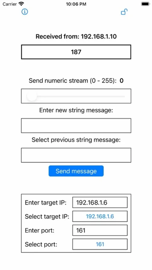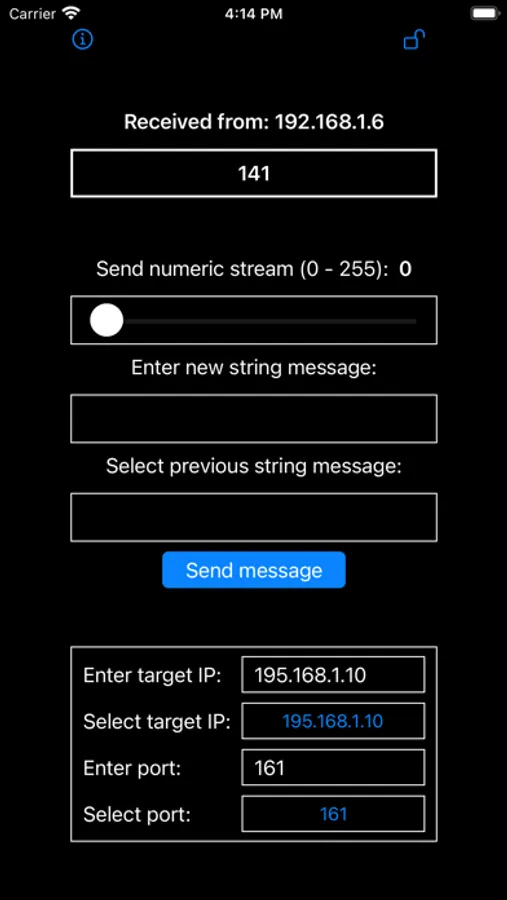 The last eight values for message, IP address, and port are stored in a picker for quick access.