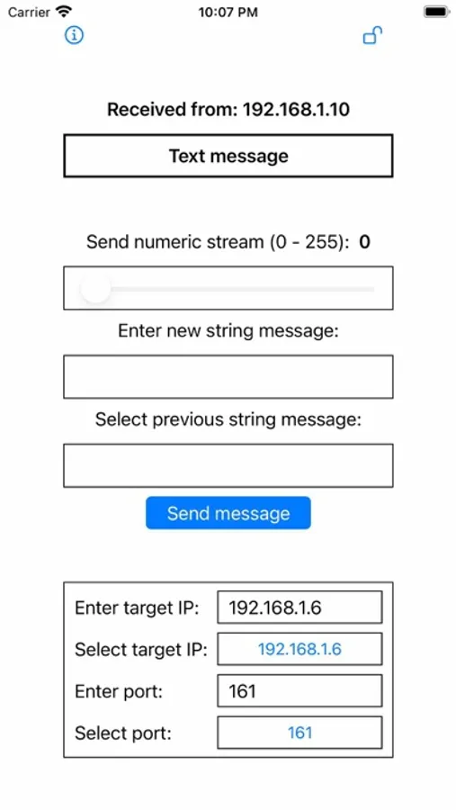Input and send text messages, or use the slider to send a stream of values between 0 and 255.