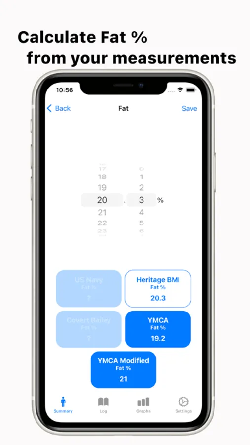 Included free with the app are all body measurements, the ability to take photos, summary screens, setting targets for weight, waist and fat %, including fat % calculators based on your circumference measurements.