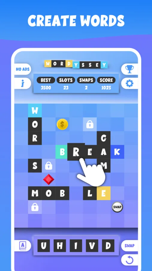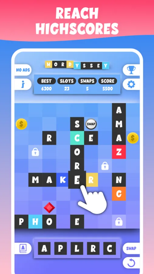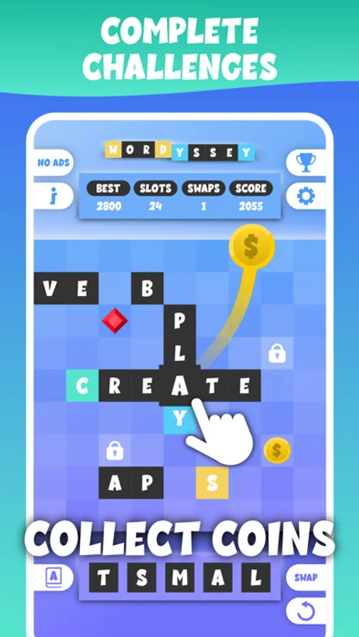 Players are presented with a set of 5 letters in their inventory at a time that they must place onto the board. The objective is to form whatever words you can think of. Words can be formed vertically or horizontally, must be a minimum of 4 letters in length, and can only be used once per game. When words are formed, they will disappear, earning the player points. Scores can also be increased by collecting coins and gems.