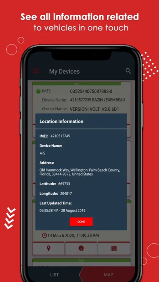 • Get details about the vehicle in use such time of journey, GPS Battery level & signal strength
