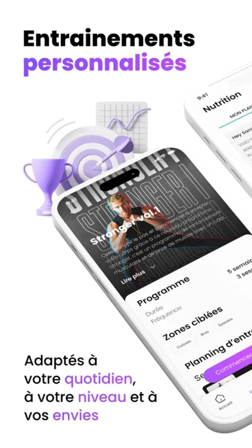 Perdre du poids, vous renforcer, ou prendre du muscle, obtenez rapidement des résultats grâce à votre programme d’entraînement et de nutrition personnalisé élaboré par votre E-coach et confectionné spécialement pour vous.