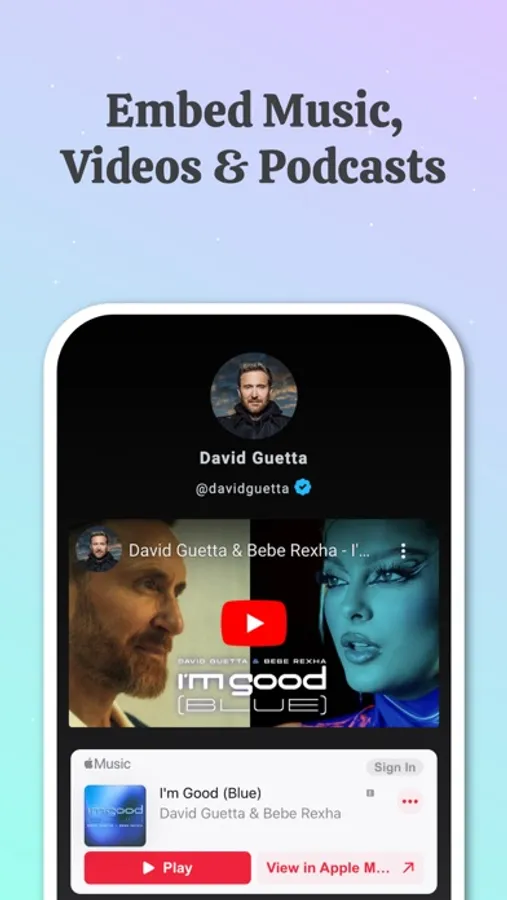 You can integrate music tracks and videos that play directly in your Lnk.Bio page.