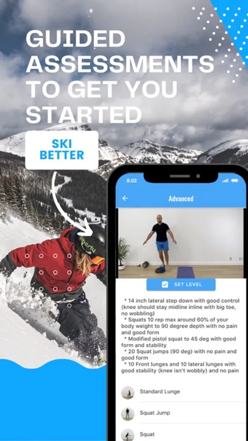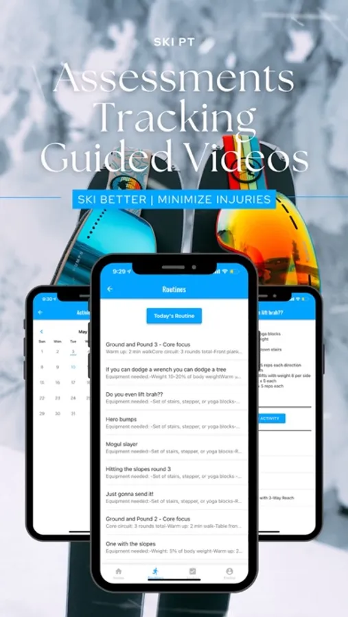 Ski PT is a pre-hab app with exercise routines aimed to build users bodies in Strength, Balance, Conditioning, and Flexibility for better skiing and injury prevention.
