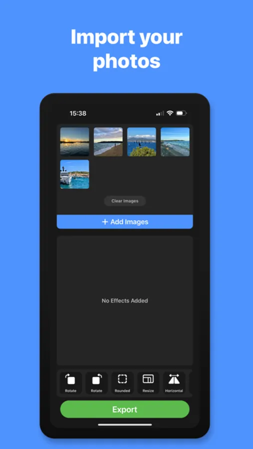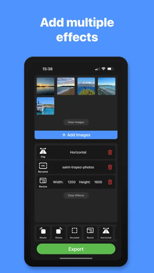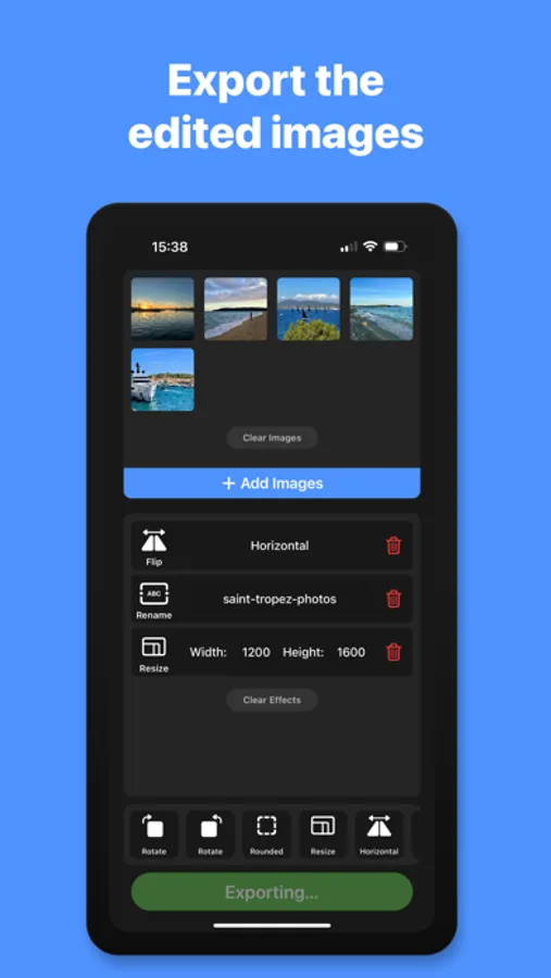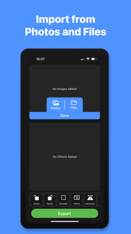 Import images from your Photo Library or from the Files app. Add a list of effects to modify your images including rotate, flip, resize, corner radius, rename, file format, compress and more.