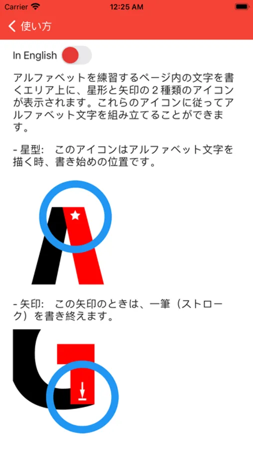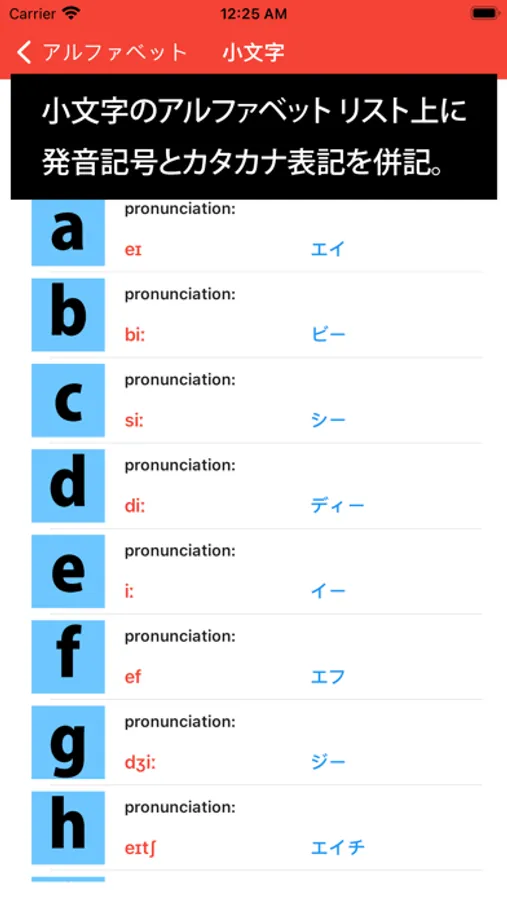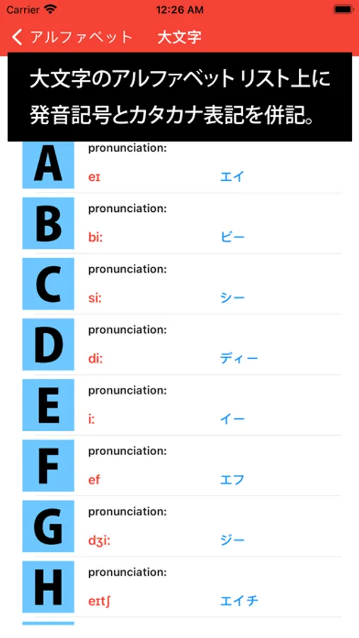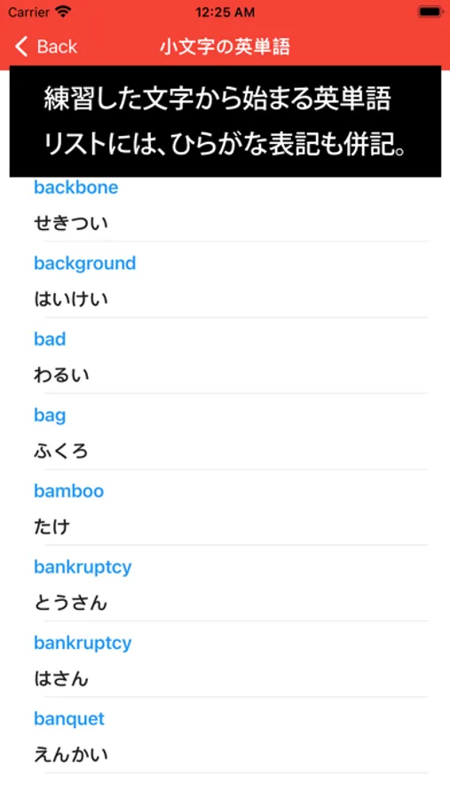 On the other part where you could practice English words that start from the letter you practiced on previous page. On this page, you could choose from English words list that shows English words and Japanese translation written in Hiragana letters, and practice each letter of the word. On the page, you could also see a pronunciation written in Katakana letters.
