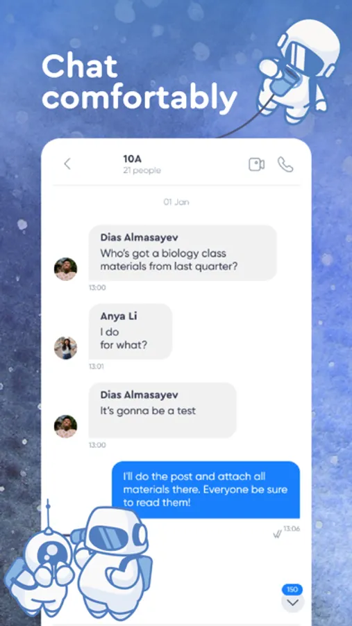 Private chat: Communicate with students in private chat rooms for individual classes and groups. Share important information, organize discussions about the past material, and simply stay in touch with your students.