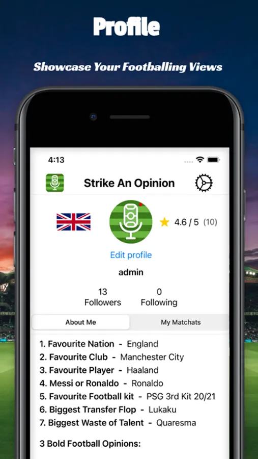 This is the base of your account, here you are able to answer a fixed set of questions so other users are able to get a glimpse of your general footballing views. You are also able to build your all-time greatest 11 and view your credibility score to see how valid others think your opinions are.