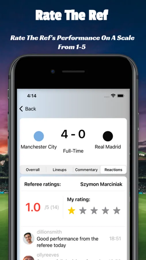 Under every game on our app, you can rate the ref's performance on a scale from 1-5 and comment your thoughts regarding the ref during the game. This is a great way to let out the frustration of those never-ending bad decisions.