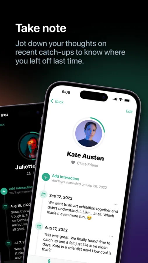 Log interactions and add notes to know where you left off last time. Use them as a diary or reminders. It's up to you. Absolute flexibility!