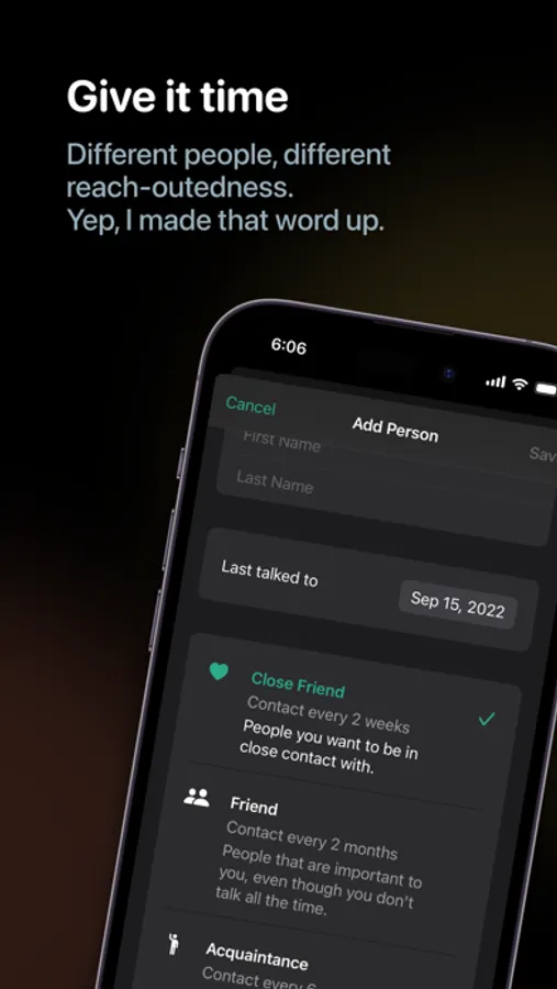 Receive a notification when it's time to get in touch again. First your little pocket computer vibrates then does your social life.