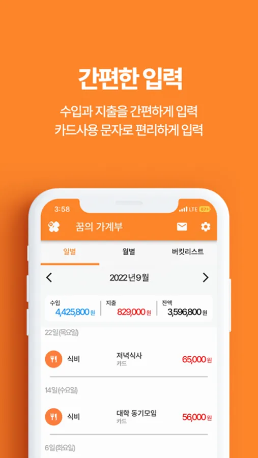 SMS문자를 읽어와서 입력없이 가계부를 작성하실 수 있습니다.