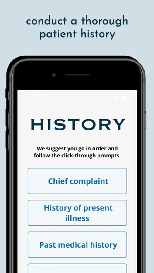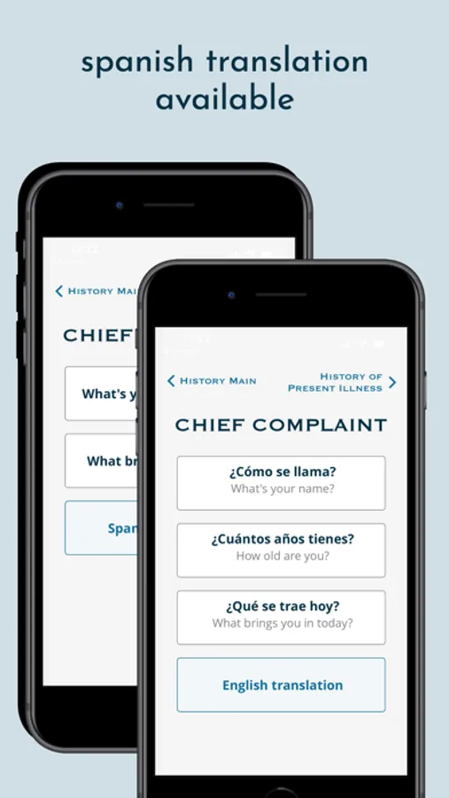 (1) History: Covers basic questions students should ask regarding the patient's condition, including chief complaint, history of present illness, family history, and social history. Instructions can be toggled between English and Spanish to aid with any language barriers.