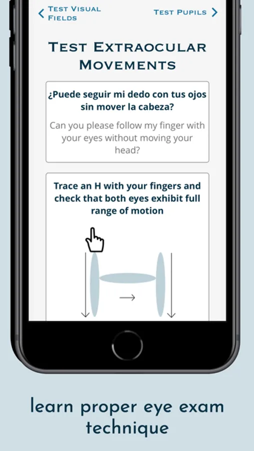 (2) Exam: Guides student through the components of the eye exam, including gross inspection, visual acuity, visual fields, extraocular movement, and pupil reactivity. EyeCheck also includes Snellen charts for determining visual acuity and flashlight for assessing pupil reactivity. Spanish instructions are directly incorporated to help best interact with Spanish-speaking patients during the exam.