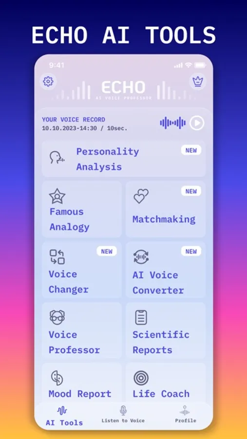 Voice truly reflects who you are, and ECHO excels at personality analysis. Our AI listens to your voice, analyzes it for insights into your personality and different personality types, and reveals intriguing aspects of your personality. What emotional state are you in? What personality traits define you? ECHO offers you the opportunity to discover yourself on a deeper level.