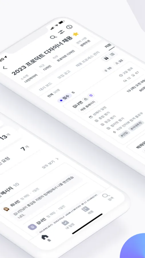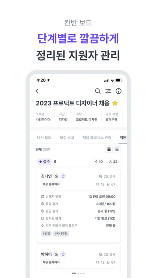 ・ 칸반 보드를 통해 단계별로 지원자가 깔끔하게 정리되어 있어요.