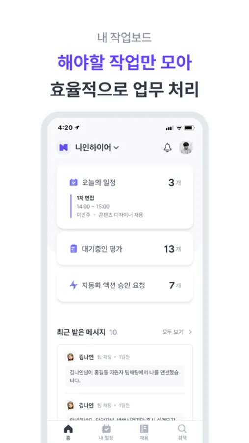 ・ [대기 중인 평가], [예정된 일정], [최근 받은 메시지]를 한 화면에서 확인하고 바로 작업을 시작할 수 있어요.