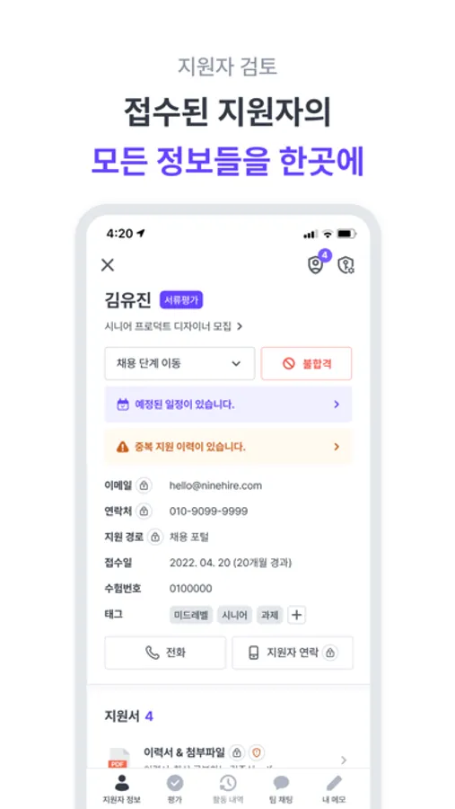 ・ 이력서를 포함한 접수된 지원자의 모든 정보를 열람할 수 있어요.