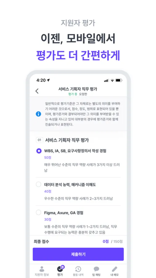 ・ 평가표 생성을 제외한 모든 웹의 평가 기능이 모바일에서도 가능해요.