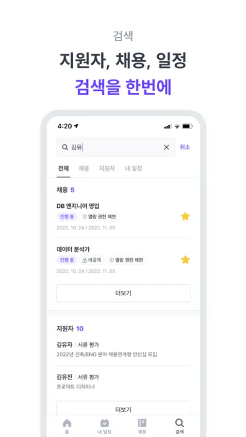・ 워크스페이스의 지원자, 채용, 일정에 대한 통합 검색이 가능해요.