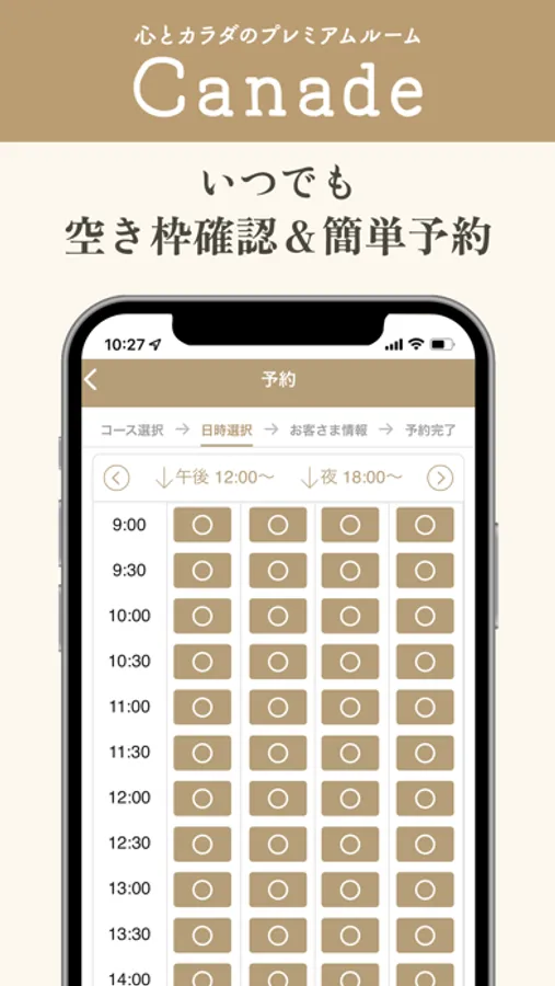 また、いつでもお手元のスマートフォンから、メニューやご希望のお時間帯のチェック・ご予約などが可能です。アプリをインストールしていただくことにより心とカラダのプレミアムルーム Canadeを、より便利に身近にご利用していただけます。