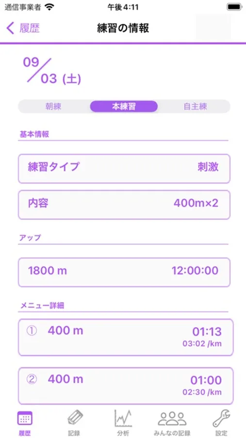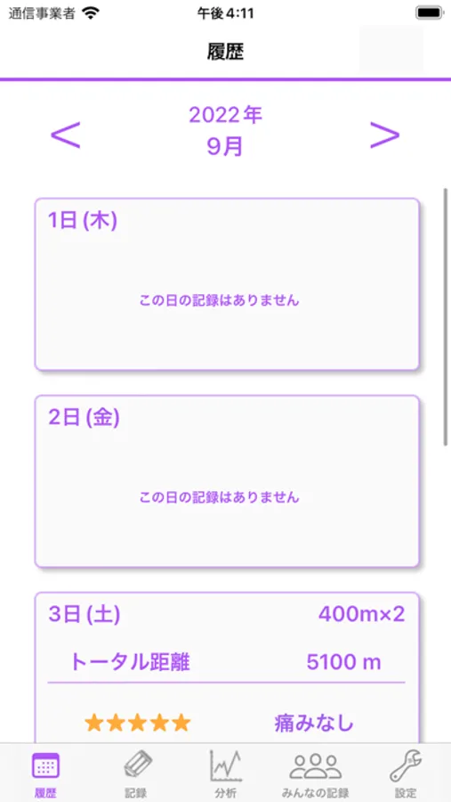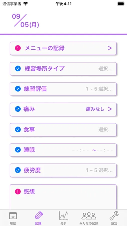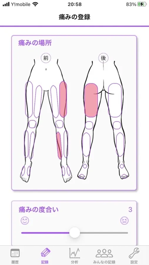 陸上にはつきものである「痛み」は、全身の人体図からタップして簡単に記録できます!