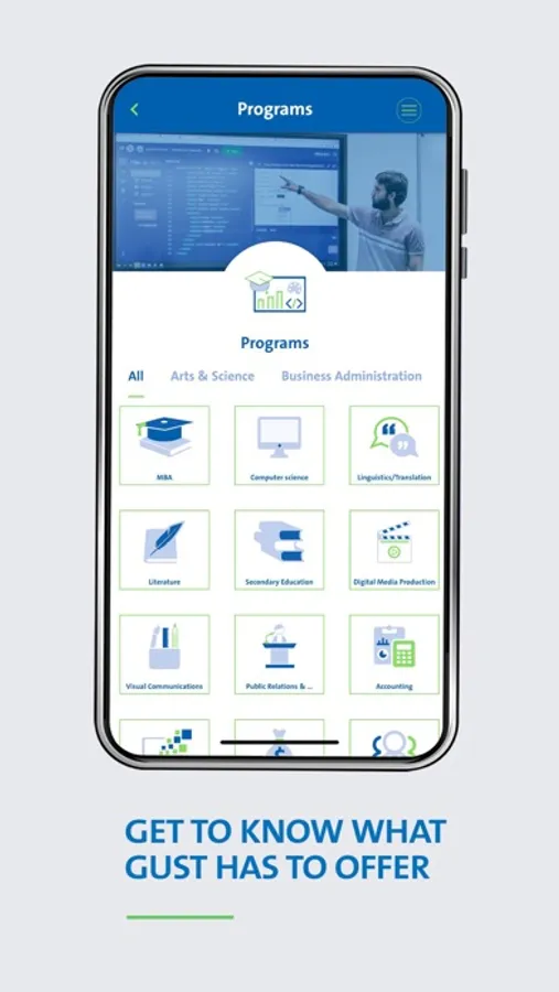 Explore GUST with the official mobile application that provides services in a centralized and easy-access manner. If you are a GUST student, you can find your profile, class schedule, exams schedule, grades throughout the semester, your daily and weekly absences, and your deadlines for courses all in one place. You can check the academic calendar and upcoming events and seminars in an easy way like never before. If you’re a GUST Alumni and misses GUST you can find your profile and a space to share your career tips, experience and business! Prospective students can explore GUST and get to know the programs offered, campus life and interesting news!