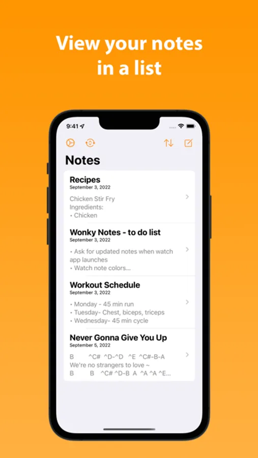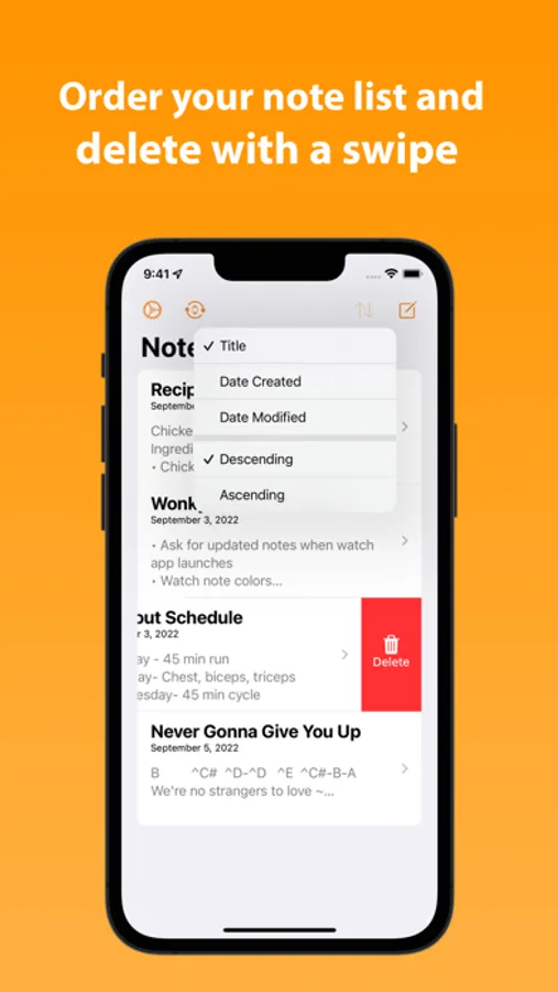 Notes can be created, edited, and deleted on iPhone or iPad and are automatically synced to the rest of your devices. The list of notes can be sorted by the title, date last modified, or the date the note was created. Notes can also be pinned to the top of your list of notes on all devices.