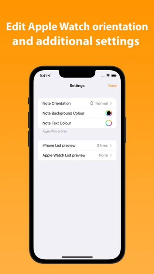 Settings allow you to set the note orientation on Apple Watch at 90 degree intervals. Additionally, enabling you set background and text colour of notes viewed on Apple Watch.