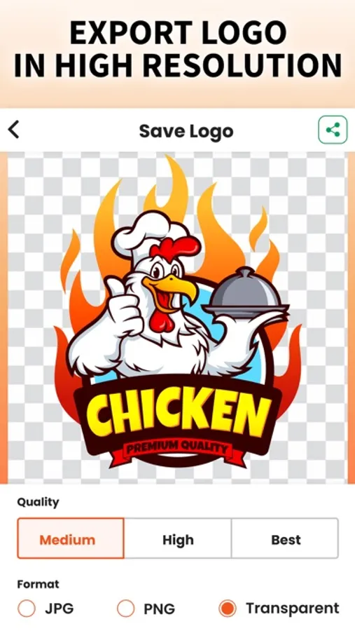 The best thing about our app is that we provide high-resolution download options. Once you make your own logo you can save the logo in PNG, JPEG, SVG, and other HD formats.