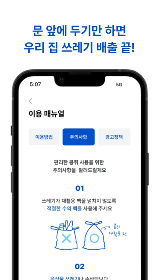 3. 수거 시간에 맞춰 쓰레기를 담아 현관문 밖에 꺼내두면, 분리수거 끝!