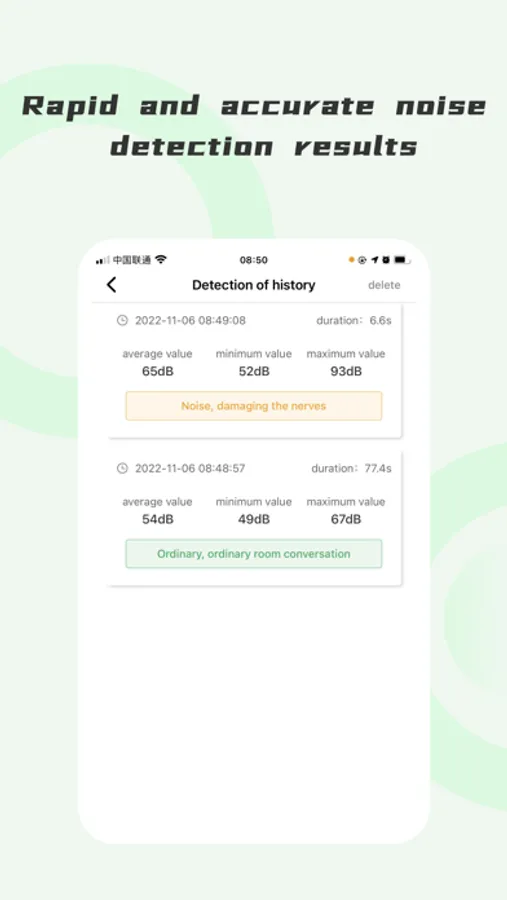- Decibel test record: the test results are stored persistently and can be viewed at any time.